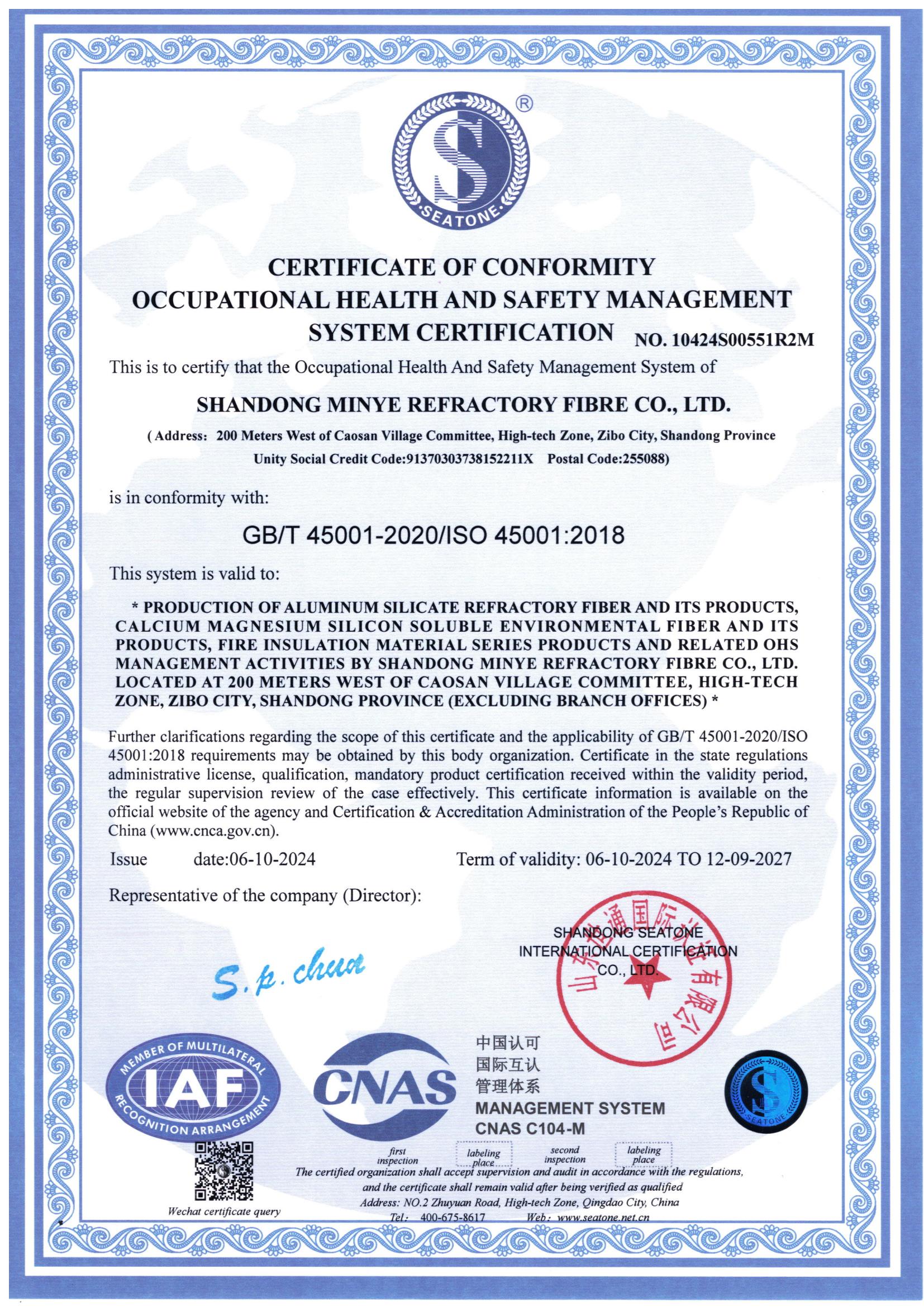 職業(yè)健康安全管理體系認(rèn)證證書
